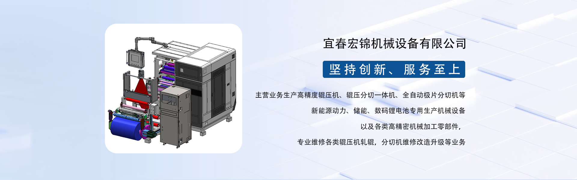 東莞市宏錦機(jī)械科技有限公司江西分公司是一家集研發(fā)、生產(chǎn)、銷售、服務(wù)于一體的創(chuàng)新型鋰電自動(dòng)化精密機(jī)械設(shè)備專業(yè)制造、服務(wù)商,坐落于江西省新余市渝水區(qū)新余經(jīng)濟(jì)開發(fā)區(qū)孵化園5號(hào)廠房,廠房面積近6000平米,由東莞市宏錦機(jī)械科技有限公司于2024年11月投資新建,交通區(qū)位優(yōu)勢(shì)明顯、產(chǎn)業(yè)配套便捷集中,擁有一批具有行業(yè)豐富經(jīng)驗(yàn)的技術(shù)人員和管理團(tuán)隊(duì)。公司主營業(yè)務(wù)生產(chǎn)高精度輥壓機(jī)、輥壓分切一體機(jī)、全自動(dòng)極片分切機(jī)等新能源動(dòng)力、儲(chǔ)能、數(shù)碼鋰電池專用生產(chǎn)機(jī)械設(shè)備以及各類高精密機(jī)械加工零部件,專業(yè)維修各類輥壓機(jī)軋輥,分切機(jī)維修改造升級(jí)等業(yè)務(wù)。根據(jù)公司發(fā)展三步走戰(zhàn)略規(guī)劃經(jīng)營現(xiàn)下設(shè)三個(gè)二級(jí)獨(dú)立運(yùn)營事業(yè)部分別為分切事業(yè)部(分切機(jī)、輥壓分切一體機(jī))、磨輥事業(yè)部(輥壓機(jī)、軋輥修磨)、機(jī)加事業(yè)部(精密機(jī)械部件加工)。經(jīng)過十余年沉淀發(fā)展主要客戶有新余贛鋒、南昌維科、宜春清陶、云南路華、河南恒一、江西程疆、四川天萊、蕪湖天弋、惠州億緯鋰能、無錫盤古新能源、鄭州比克、安徽鋰天下、臺(tái)灣長利(宏基集團(tuán))、重慶維都利(紫建電子)、贛州諾威、安徽利維能、漳州萬寶、重慶佳寶成、廣西皇冠儲(chǔ)能等一批具有行業(yè)知名度和影響力的企業(yè)。公司在新能源發(fā)展的道路上堅(jiān)持創(chuàng)新,為客戶帶來穩(wěn)定、高效的自動(dòng)化專用設(shè)備和更大的收益。